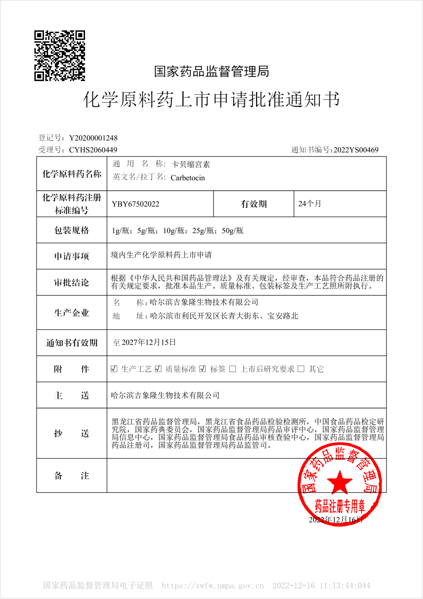 公司卡贝缩宫素原料药获得化学原料药上市申请批准通知书